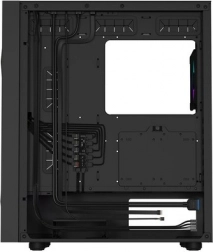Skriňa je pripravená na vodné chladenie s podporou AIO až 420 mm na čele, 280 mm na hornej pozícii a 120 mm vzadu. Vnútorný priestor pojme dlhé grafické karty a vysoké vežové chladiče, nechýba premyslené vedenie kabeláže, gumové priechodky a PSU tunel pre čistý vzhľad.