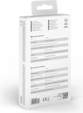 Nabíjačka Savio s výkonom 20 W umožňuje kompatibilitu so širokou škálou zariadení vďaka portu USB-C. Ideálna pre smartfóny, tablety a ďalšie mobilné pristroje. Vďaka kompaktným rozmerom (80 × 42,5 × 27 mm) je ľahko prenosná, čo ju robí skvelým spoločníkom na cesty.
