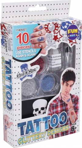 Sada na dočasné trblietavé tetovanie pre chlapcov: 4 opakovane použiteľné šablóny, 3 farby trblietok, lepidlo, štetec a návod. Skvelá zábava pre deti od 6 rokov.
