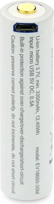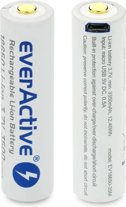 Batéria EverActive 18650 s kapacitou 3500 mAh je ideálna pre profesionálne použitie, vďaka integrovanému micro USB pre priame nabíjanie. Táto batéria je vybavená originálnym článkom Samsung 35E a poskytuje elektronickú ochranu PCM, ktorá chráni pred nadmerným vybitím, prebitím a skratom.