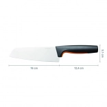 Objavte univerzálny kuchynský nôž v ázijskom štýle – santoku s dĺžkou čepele 16 cm z radu FISKARS Functional Form. Ponúka japonskú nehrdzavejúcu oceľ pre dlhotrvajúcu ostrosť, ergonomickú rukoväť so SoftGrip pre istý úchop a bezpečný chránič prstov pre pohodlné a bezpečné krájanie. Ideálny na zeleninu, mäso aj bylinky, ľahko sa používa, čistí a možno ho umývať v umývačke.