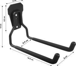 Nástenný držiak je riešením pre každého, kto chce mať v garáži či dielni poriadok. Robustná oceľová konštrukcia zaisťuje dlhú životnosť a maximálnu nosnosť 35 kg umožňuje využitie pre rôzne účely. Vďaka čiernemu dizajnu sa hodí do každého interiéru.