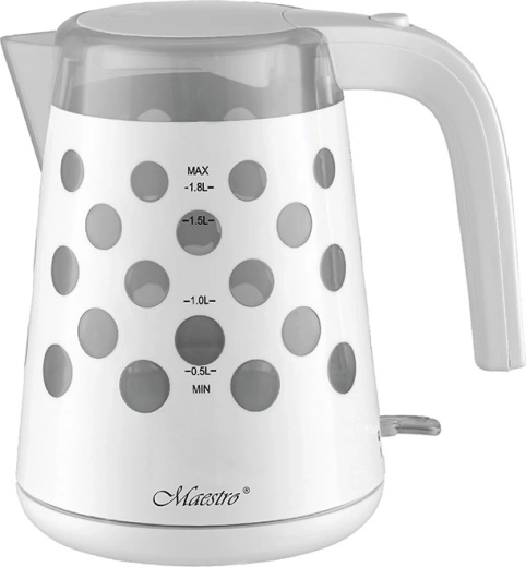 Maestro KROPKI biela rýchlovarná kanvica je ideálna pre každú kuchyňu. S kapacitou 1,7 litra a výkonom 2200 W zabezpečuje rýchle varenie vody. Skrytý vykurovací prvok nielen zlepšuje estetiku, ale aj uľahčuje čistenie, zatiaľ čo modré LED podsvietenie dodáva moderný vzhľad.