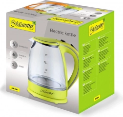 Elektrická kanvica Maestro s výkonom 2000 W kombinuje eleganciu a funkčnosť. Sklenené telo spolu s odolnou plastovou rukoväťou zabezpečujú jednoduchú manipuláciu a dlhú životnosť. Kanvica navyše disponuje filtrom proti vodnému kameňu, čo zaručuje čistú vodu a ochranu proti usadeninám.