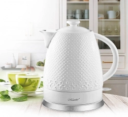 Elegantná keramická rýchlovarná kanvica MAESTRO s objemom 1,5 l a príkonom 1500 W prináša rýchle varenie vody a moderný dizajn do každej kuchyne. Ponúka 360° otočnú základňu, skryté vykurovacie teleso, podsvietený vypínač a automatické vypnutie pre maximálne pohodlie a bezpečnosť.