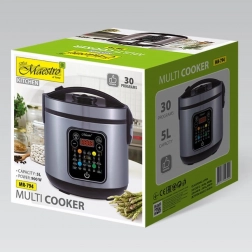Multivarník MAESTRO MR-794 s objemom 5 litrov a výkonom 900 W je univerzálny pomocník na varenie, vyprážanie aj pečenie. Ponúka 30 programov, dotykové ovládanie, odložený štart aj udržiavanie teploty až 24 hodín. Odolná nerezová a plastová konštrukcia, nepriľnavá misa a automatické čistenie zaručujú pohodlie a jednoduchú údržbu.