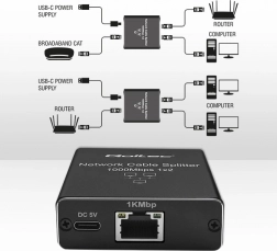 Kompaktný splitter/switch s rozhraním RJ45 umožní rozdeliť sieťový signál na dve výstupné linky pri rýchlosti až 1 Gbps a na vzdialenosť až 100 m. Ponúka 3 porty RJ45 (1× vstup, 2× výstup), odolné hliníkové šasi, pozlátené konektory a jednoduché Plug & Play zapojenie bez zložitej konfigurácie.