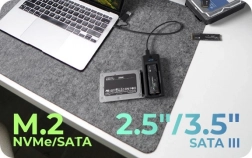 Stanica umožňuje napájanie diskov M.2 a 2,5" cez USB 3.0 alebo Type-C; len 3,5" disky vyžadujú externé napájanie.