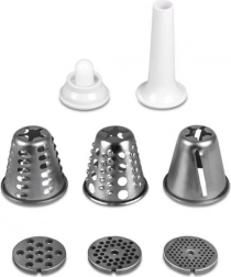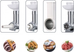 Bohatá výbava premení váš mlynček na všestranný kuchynský nástroj: tri mlecie sitká 3/5/8 mm pre požadovanú štruktúru mletia, plničku klobás a nadstavec na kebbe a tiež sadu strúhadiel vrátane nového strúhadla na zemiaky. Praktický vstavaný úložný priestor pojme nepoužívané sitká a časti pre klobásy a kebbe uložíte do pechovača. Pripravíte tak mleté mäso, domáce údeniny, paštéty, zemiakové placky, čerstvé šaláty aj nastrúhaný syr.