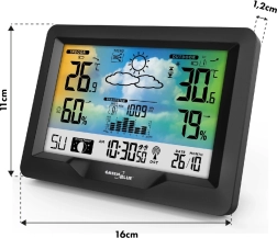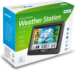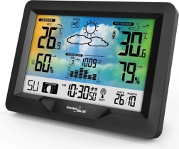 Moderná bezdrôtová meteorologická stanica GREENBLUE s farebným displejom, rádiovo riadeným časom DCF, vnútorným aj vonkajším meraním teploty a vlhkosti, barometrom, mesačnými fázami a grafickou predpoveďou počasia. Vďaka bezdrôtovému snímaču sleduje podmienky až do vzdialenosti 60 m a ukazovateľ komfortu prostredia pomáha udržať zdravú klímu doma.