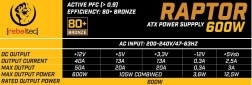 Napájací zdroj Raptor prináša na trh špičkovú výkonovú rezervu vďaka pokročilej konštrukcii a vysoko kvalitným komponentom. Na siene +12V účinne generuje 600W pre napájanie CPU a grafickej karty, zatiaľ čo pre ďalšie linky poskytuje rozšírujúci výkon až k celkovým 721W.