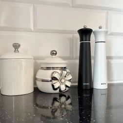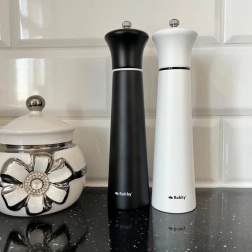 Vďaka premyslenej konštrukcii sa mlynčeky pohodlne plnia odskrutkovaním horného gombíka a vrchnej časti. Matný povrch v čiernej a bielej farbe sa hodí do každej kuchyne a ľahko sa udržiava – stačí ich utrieť suchou handričkou. Skvelý tip na štýlový darček pre milovníkov varenia.