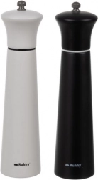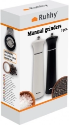 Elegantná súprava dvoch ručných mlynčekov RUHHY v čiernej a bielej farbe na čerstvo mletú soľ a korenie. Ponúka keramický mlecí mechanizmus, plynulú reguláciu hrubosti mletia a ergonomický tvar pre pohodlné používanie. Vďaka kvalitným materiálom a modernému dizajnu sú mlynčeky odolné, presné a ľahko sa čistia.