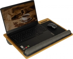 Elegantný drevený stolík na lono kombinuje pohodlie, funkčnosť a odolnosť. Prírodná drevená doska je pevná a príjemná na dotyk, zatiaľ čo mäkké vankúšové dno sa prispôsobí vašim kolenám a zaisťuje stabilitu bez šmýkania. Ergonomická opierka zápästí znižuje únavu pri dlhšej práci s notebookom.