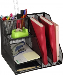 Pridajte poriadok na svoj pracovný stôl s týmto elegantným kovovým organizérom. So šiestimi rôzne veľkými priehradkami môžete ľahko usporiadať ceruzky, perá, nožnice, sponky a ďalšie drobné predmety. Vysoké, vertikálne priehradky sú ideálne pre uloženie kalendárov, zápisníkov alebo zložiek na dokumenty.