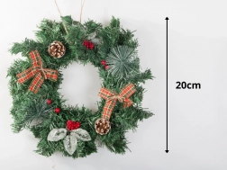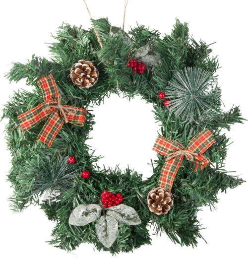 Vytvorte si doma rozprávkovú sviatočnú atmosféru. Tento dekoratívny vianočný veniec spája realistické zelené ihličie s prírodnými šiškami, červenými bobuľami a károvanými mašľami. Vďaka kompaktnému priemeru 20 cm sa hodí na vchodové dvere, do okien, nad krb aj na slávnostne prestretý stôl.