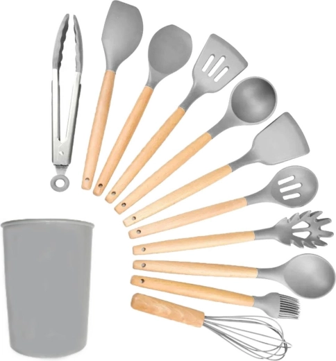 Materiál: drevo + TPE silikón pre nástroje a PP plast pre nádobu. Odoláva vysokým teplotám a je navrhnutý pre dlhú životnosť.