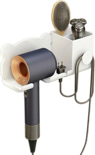 Nástenný držiak na fén. Mimoriadne pohodlné a priestorovo úsporné riešenie. Veľmi jednoduchá a neinvazívna inštalácia pomocou obojstrannej pásky. Vybavený dvoma priehradkami na drobné predmety a ďalším háčikom na prednej strane. Výborne poslúži ako prídavná polička na kozmetiku alebo zubné kefky.