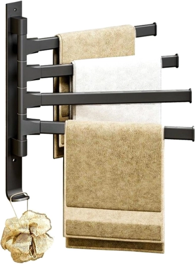 - Rukoväť má štyri nastaviteľné ramená na zavesenie uterákov.