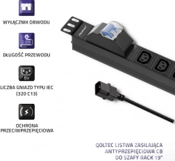 Lišta disponuje 8 zásuvkami typu IEC 320 C14 a prepäťovým ističom pre bezpečnosť pripojených zariadení.