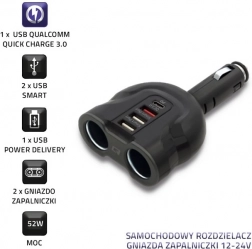 Rozšírte možnosti napájania vo svojom aute. Rozdvojovač Qoltec kombinuje moderný dizajn a funkčnosť: dve samostatné zásuvky zapaľovača ponechajú plnú možnosť využitia auto príslušenstva, zatiaľ čo USB porty s podporou Quick Charge 3.0 a Power Delivery zaistia rýchle a efektívne nabíjanie vašich zariadení.