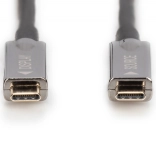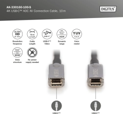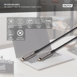 Aktívny hybridný kábel USB‑C–USB‑C pre prenos nekomprimovaného obrazu a zvuku až v UHD 4K @ 60 Hz s priepustnosťou až 21,6 Gbit/s. Vďaka opticko‑medenej konštrukcii je ľahký, ohybný a odolný voči EMI, ideálny pre dlhšie trasy (10 m). Podporuje DisplayPort 1.2 a USB‑C DP Alt Mode, funguje na princípe plug and play bez externého napájania.