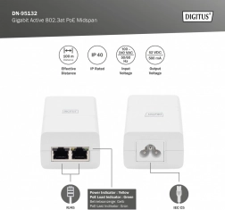 Aktívny midspan PoE injektor na vnútorné použitie kombinuje dáta aj napájanie do jedného ethernetového kábla a výrazne zjednodušuje inštaláciu sieťových zariadení. Podporuje IEEE 802.3at (PoE+) so spätnou kompatibilitou s IEEE 802.3af, poskytuje výstup 52 V DC / 0,58 A (až 30 W) a pracuje s rýchlosťami 10/100/1000 Mb/s. Dva porty RJ45 (LAN a PoE) umožnia bezproblémové napájanie a prenos dát na vzdialenosť až 100 metrov po kabli Cat5e/Cat6.