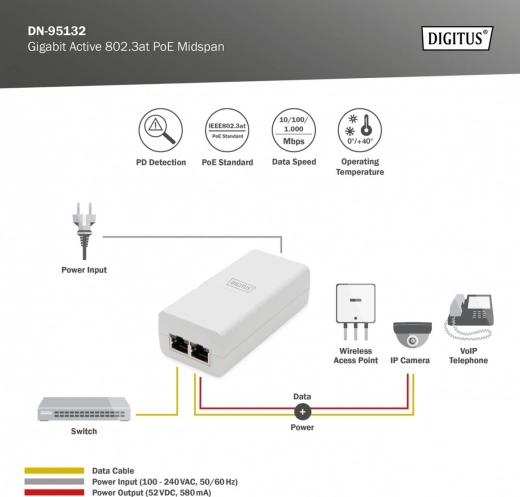 Napájajte náročnejšie PD zariadenia – prístupové body, IP kamery či VoIP – vďaka výstupu 52 V DC / 0,58 A (až 30 W) podľa IEEE 802.3at, spätne kompatibilné s 802.3af.