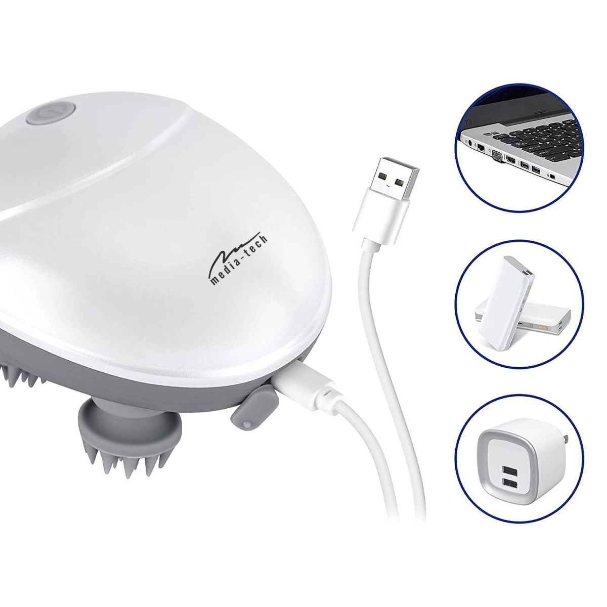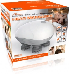 Media-Tech Head Massager je ergonomický ručný masér, ktorý vďaka štyrom mäkkým masážnym hlavám so silikónovými výstupkami realisticky simuluje profesionálnu masáž prstami. Je ľahký, ľahko ovládateľný a ideálny na každodenné použitie doma aj v kancelárii.