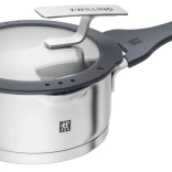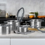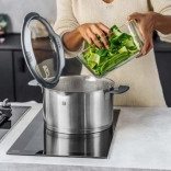 Súprava piatich hrncov ZWILLING Simplify kombinuje elegantný dizajn, vysokú odolnosť a premyslené funkcie pre každodenné varenie. Sklenené pokrievky so silikónovým okrajom pevne sedia, majú integrované sitko na rýchle zlievanie a možno ich pripevniť vo zvislej polohe na okraj hrnca – menej kvapiek na linke a viac miesta pri práci.