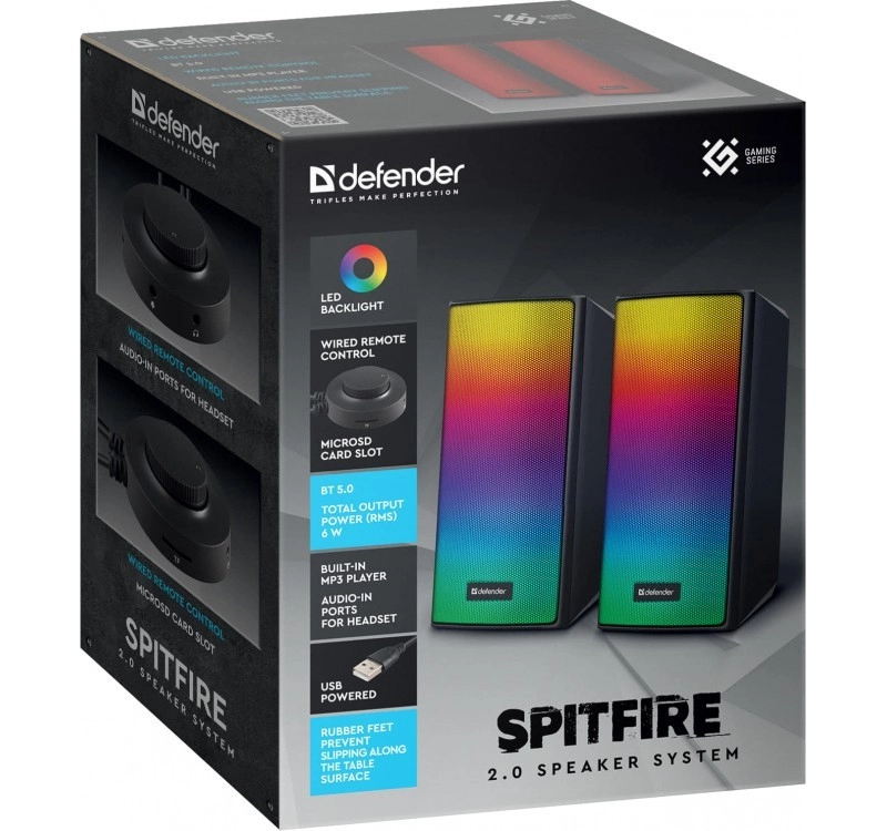 Vychutnajte si čistý stereo zvuk v elegantnom prevedení. Reproduktory DEFENDER Spitfire 2.0 kombinujú stabilné Bluetooth 5.2 s nízkou spotrebou, jednoduché zapojenie cez USB napájanie a efektné LED prvky, ktoré oživia každý herný aj pracovný set-up.