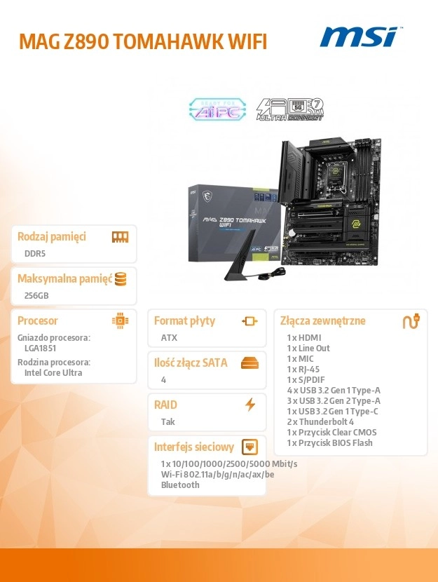 Výkonná herná základná doska MSI MAG Z890 Tomahawk WiFi je navrhnutá pre hráčov, ktorí vyžadujú stabilitu, trvanlivosť a jednoduchú inštaláciu. S podporou Wi-Fi 7, 5G LAN, Thunderbolt 4 a PCIe 5.0 je ideálna pre najnovšie procesory Intel Core Ultra.