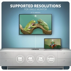 HDMI výstup zabezpečuje kvalitný obraz až do rozlíšenia 8K/30Hz a 4K/120Hz Ultra HD, vrátane viackanálového zvuku. Podporované sú vysoké obnovovacie frekvencie v populárnych herných rozlíšeniach až do 240Hz. Pre správnu funkciu je vyžadovaný port USB-C alebo Thunderbolt 3/4 s aktívnym režimom DisplayPort (DP Alt Mode).