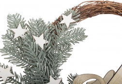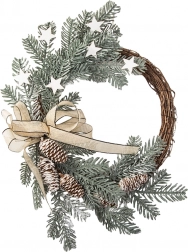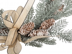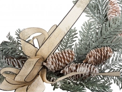 Realistické ihličie, prírodné šišky, drevené hviezdičky a béžová mašľa vytvárajú harmonickú kompozíciu, ktorá rozžiari vaše vstupné dvere aj obývaciu izbu.