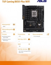 ASUS TUF GAMING B650-PLUS WIFI využíva najnovšiu platformu AMD s päticou AM5 pre procesory Ryzen a spája ju s dôrazom na odolnosť, stabilné napájanie a efektívny odvod tepla. Konštrukcia z komponentov vojenskej triedy a dôkladné záťažové testy zaručujú dlhodobú spoľahlivosť aj v náročných herných zostavách.