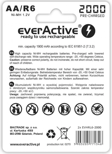 Nabíjacie batérie AA 2000 mAh v technológii Ready To Use sú ideálne na každodenné použitie v diaľkových ovládačoch, hračkách, svietidlách aj fotoaparátoch. Vďaka prednabitiu ich môžete hneď vybrať z blistra a používať, bez nutnosti prvého nabíjania.