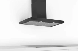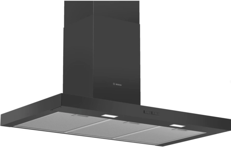 Elegantný komínový odsávač pár Bosch v čiernej farbe, navrhnutý pre moderné kuchyne, zabezpečuje účinné vetranie a čistenie vzduchu nad varnou plochou.