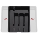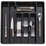Praktický čierny organizér do zásuvky s rozťahovacím mechanizmom sa ľahko prispôsobí šírke zásuvky a udrží všetky príbory aj kuchynské náradie na svojom mieste. Vyrobený z odolného PP, má hladký povrch na jednoduché čistenie a ponúka až 7 prehľadných priehradok. Ideálny na univerzálne použitie, rýchlu organizáciu a moderný vzhľad v každej kuchyni.