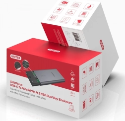 Dvojitý, vysokokvalitný čipset s podporou UASP umožňuje efektívne spracovanie príkazov a až o desiatky percent vyššie rýchlosti oproti bežnému USB. Podpora TRIM pomáha udržať konzistentný výkon a dlhšiu životnosť vašich NVMe diskov. Hliníkové šasi s integrovaným ventilátorom a priložené teplovodivé podložky zaručujú stabilné teploty aj pri dlhých prenosoch. Mechanizmus Secure‑Lock chráni proti náhodnému otvoreniu a umožňuje rýchlu výmenu diskov bez náradia.
