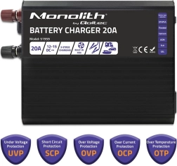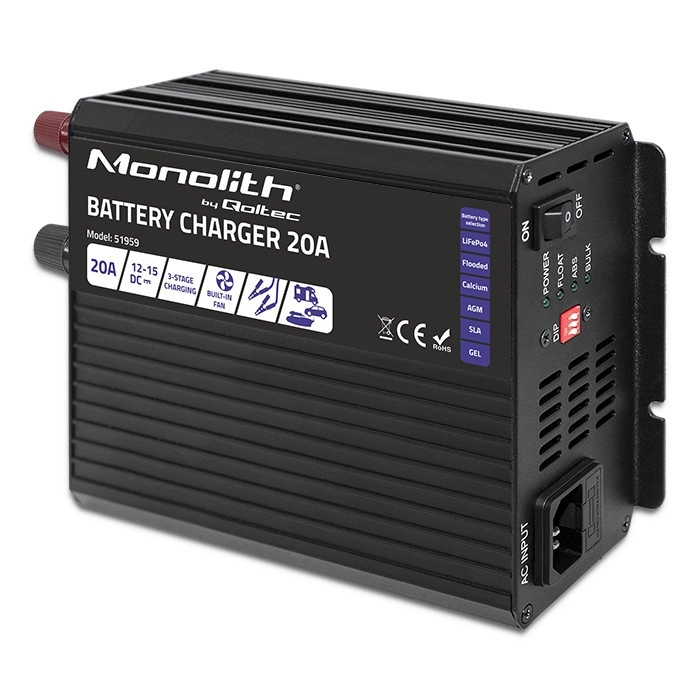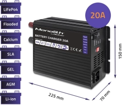 Nabíjačka MONOLITH 12 V / 20 A bola navrhnutá pre rýchle, bezpečné a šetrné dobíjanie štartovacích aj trakčných akumulátorov. 3-stupňový algoritmus BULK – ABS/BOOST – FLOAT automaticky prispôsobí napätie a prúd stavu batérie, skracuje čas nabíjania a predlžuje jej životnosť. LED kontrolky prehľadne ukazujú aktuálnu fázu.