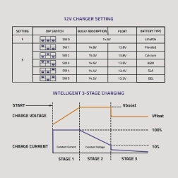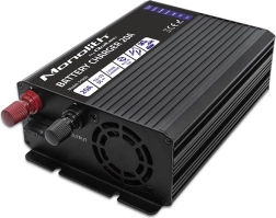 Vďaka DIP prepínaču zvolíte z viacerých režimov pre rôzne chémie: LiFePO4, AGM, GEL, SLA/olovené (vrátane Ca, flooded) aj režim stabilného napájacieho zdroja. Odolné hliníkové šasi zabezpečuje lepší odvod tepla, aktívny ventilátor chráni elektroniku pri vysokej záťaži a po plnom dobití sa zariadenie automaticky prepne do udržiavacieho/standby režimu.