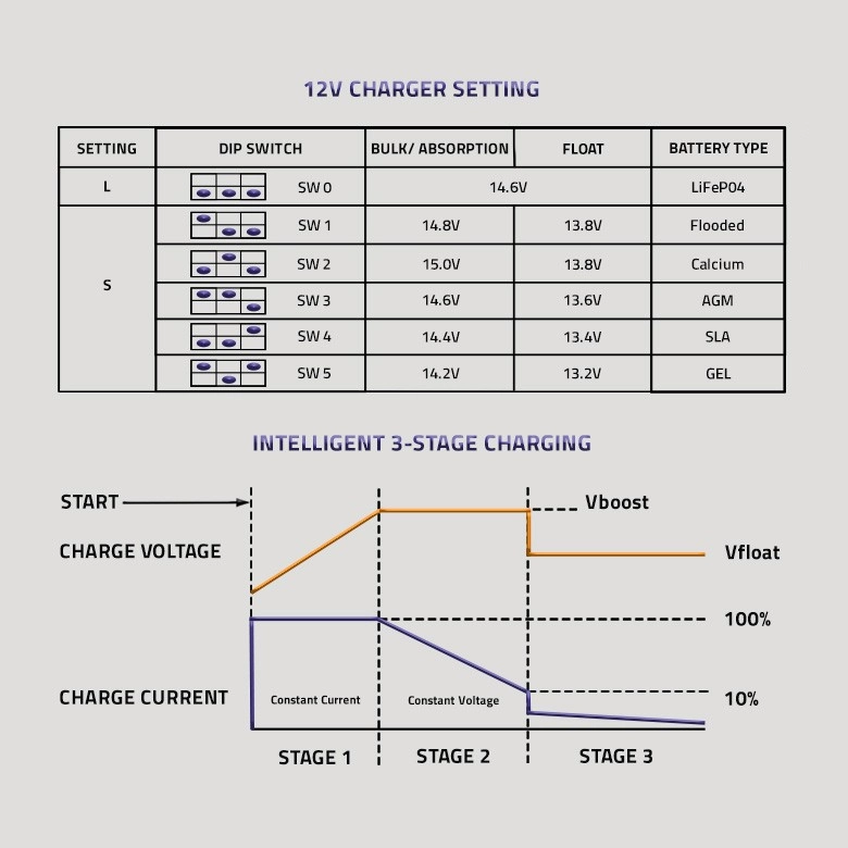 Pomocou DIP prepínača zvolíte optimálny profil pre LiFePO4, AGM, GEL, SLA/olovené (vrátane Ca, flooded) alebo režim stabilného napájacieho zdroja. Jedna nabíjačka pre viac typov akumulátorov.
