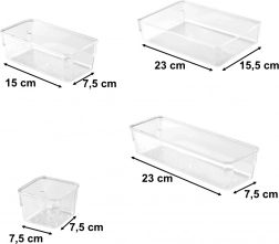 Organizéry z kvalitného akrylu sú ľahké, no pevné a odolné. Skvele sa hodia na písacie potreby, kozmetiku, šperky, kuchynské drobnosti alebo dielenské komponenty. Sada je ideálna na rýchlu organizáciu a minimalizáciu neporiadku v domácnosti aj kancelárii.