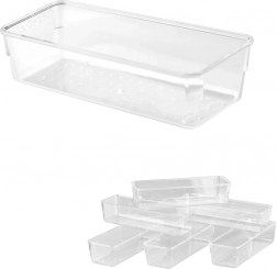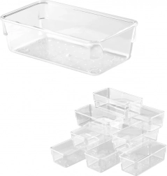 Táto viacúčelová sada organizérov kombinuje čistý dizajn a praktickú funkčnosť. Priehľadné prevedenie umožňuje okamžitú kontrolu obsahu a vďaka rôznym veľkostiam ľahko prispôsobíte rozloženie každej zásuvke, polici aj pracovnej ploche.