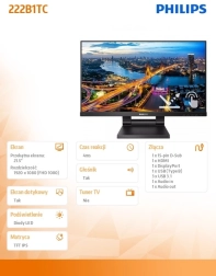 Philips 21,5 palcový dotykový monitor spája elegantný dizajn s najmodernejšími technológiami, ideálny pre každodennú prácu aj zábavu. Vďaka IPS technológii získate skutočne verné farby a stabilný displej z rôznych uhlov.