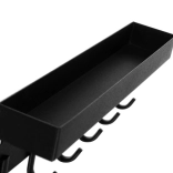 Tento univerzálny nástenný organizér spája funkčnosť a minimalistický dizajn. Kovová konštrukcia s práškovým lakom zaisťuje dlhú životnosť, zatiaľ čo horná police so zvýšeným okrajom (cca 2,3 cm) bezpečne udrží telefón, peňaženku, poštu či drobnosti. Šesť pevných háčikov je ideálnych na kľúče, šály, tašky alebo kuchynské náradie.