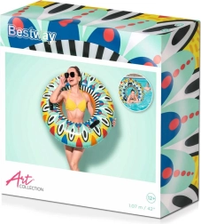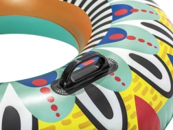Plávací kruh Fiesta prináša späť do bazéna štýl a radosť vďaka svojej živej grafike a pestrým farbám. S priemerom 107 cm a dvoma čiernymi rukoväťami pre jednoduché uchopenie zaručuje bezpečnosť pre deti od 12 rokov aj dospelých. Integrovaný bezpečnostný ventil umožňuje jednoduché nafukovanie a vypúšťanie, takže skladovanie je hračka.