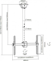 Univerzálny stropný držiak pre televízory LCD/LED 37–70" s nosnosťou 50 kg. Robustná oceľová konštrukcia zabezpečuje bezpečné uchytenie, kompatibilita VESA, skrytie káblov, nastaviteľná dĺžka, náklon aj otáčanie a možnosť montáže aj na šikmé stropy.