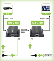 - Predĺženie HDMI až 60 m po jednom kábli RJ45 (odporúčané Cat6/Cat7)