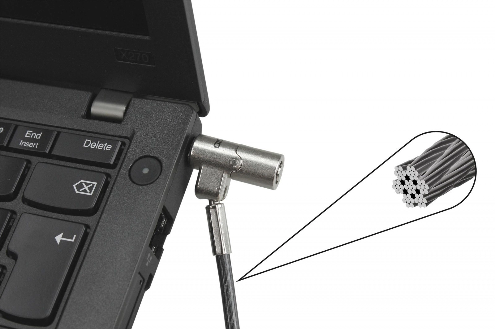 Zabezpečte svoj tenký notebook rýchlo a efektívne. Tento Nano Ultra Slim zámok je kompatibilný so slotom 2,5 × 6 mm a je navrhnutý pre zariadenia s hlavou zámku väčšou než 11 mm. Viacžilové oceľové lanko s PVC povlakom poskytuje vysokú odolnosť proti prestrihnutiu, zatiaľ čo gumový doraz chráni povrch zariadenia.